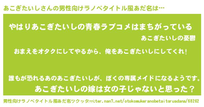 | 女子向けラノベタイトル風あだ名 | 『あこぎたいし夫妻のなれそめ』 |