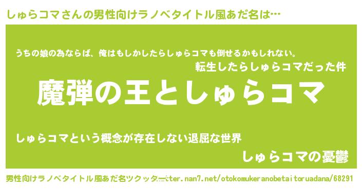| 女子向けラノベタイトル風あだ名 | 『しゅらコマが死なない童話 林檎のしゅらコマの診療簿』 |