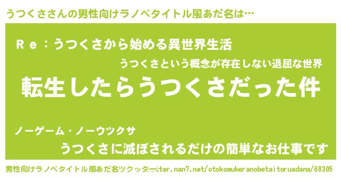 | 女子向けラノベタイトル風あだ名 | 『うつくさの玉の輿計画!』 |