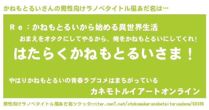 かねもとるいさんの男性向けラノベタイトル風あだ名をツクッター!