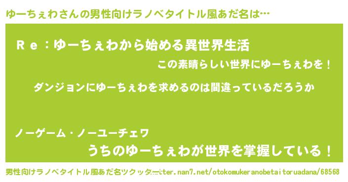 | 女子向けラノベタイトル風あだ名 | 『ゆーちぇわの卵を拾いまして』 |