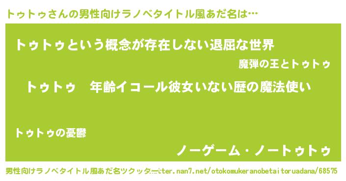 | 女子向けラノベタイトル風あだ名 | 『トゥトゥの玉の輿計画!』 |