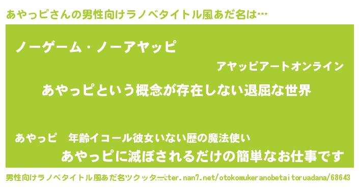 | 女子向けラノベタイトル風あだ名 | 『異世界で失敗しない100のあやっピ』 |