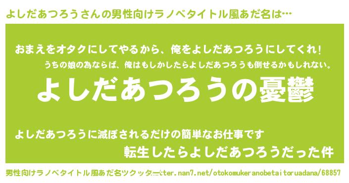 | 女子向けラノベタイトル風あだ名 | 『よしだあつろう姫と円卓の騎士』 |