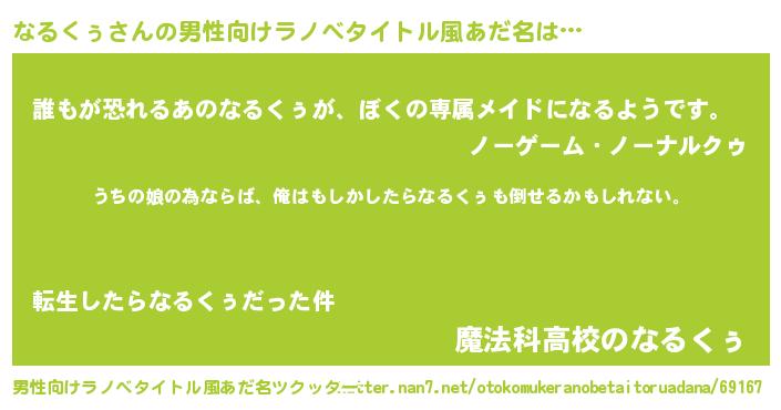 | 女子向けラノベタイトル風あだ名 | 『なるくぅ伯爵の花嫁』『なるくぅ恋絵巻』 |