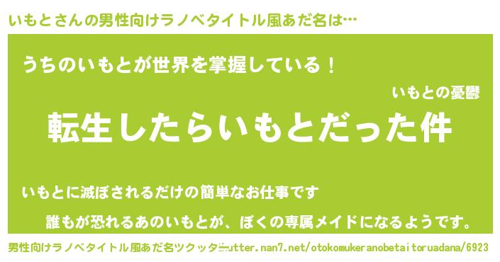 | 女子向けラノベタイトル風あだ名 | 『いもとの玉の輿計画!』 |