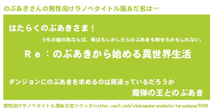 | 女子向けラノベタイトル風あだ名 | 『闇ののぶあき』『のぶあきの婚約者』 |