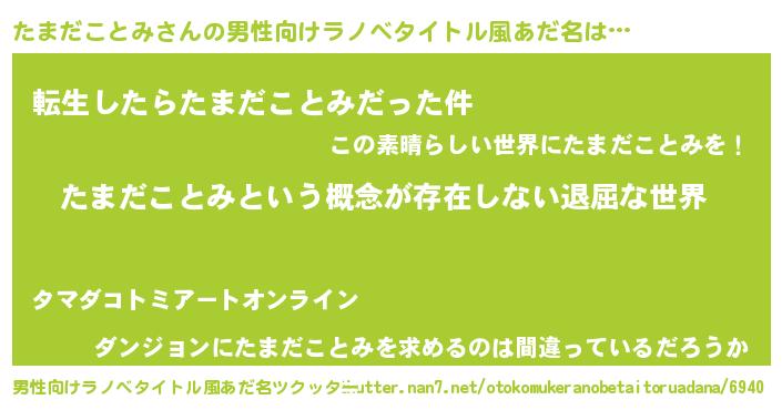 | 女子向けラノベタイトル風あだ名 | 『異世界で失敗しない100のたまだことみ』 |