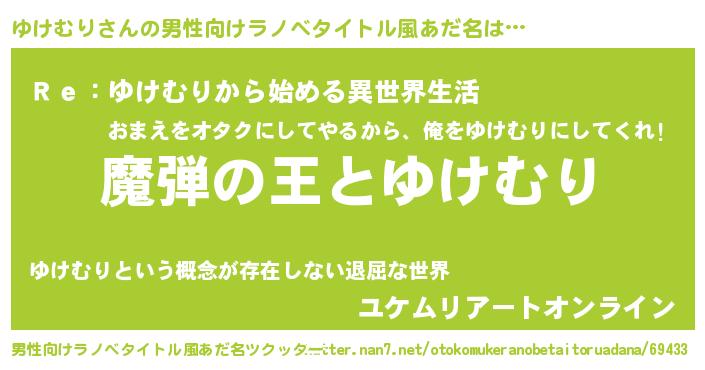 | 女子向けラノベタイトル風あだ名 | 『乙女ゲームの破滅フラグしかない悪役ゆけむりに転生してしまった…』 |
