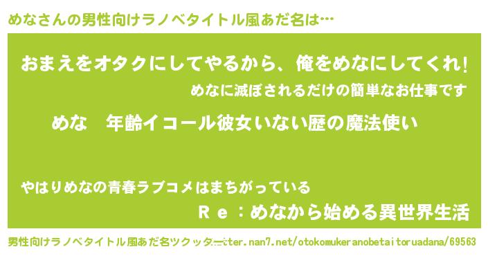 | 女子向けラノベタイトル風あだ名 | 『めなの玉の輿計画!』『闇のめな』 |