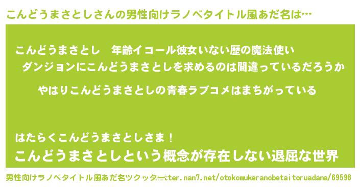 | 女子向けラノベタイトル風あだ名 | 『こんどうまさとし伯爵の花嫁』 |