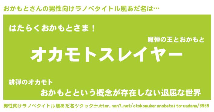 | 胡散臭い通販商品みたいなあだ名 | 『絶対に幸福をもたらす水素水…その名も「おかもと」』 |