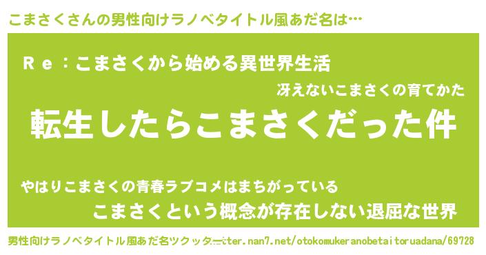 | 意味不明あだ名 | 『もやし科こまさく属』『自称こまさく』 |