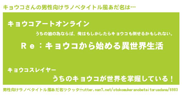 | 女子向けラノベタイトル風あだ名 | 『闇のキョウコ』『キョウコの婚約者』 |