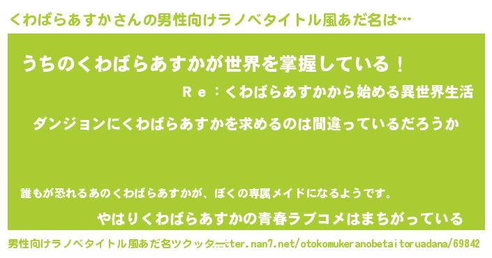 | 女子向けラノベタイトル風あだ名 | 『くわばらあすかの卵を拾いまして』 |