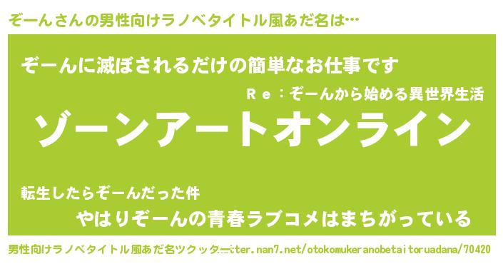 | 女子向けラノベタイトル風あだ名 | 『ぞーん姫と円卓の騎士』『闇のぞーん』 |