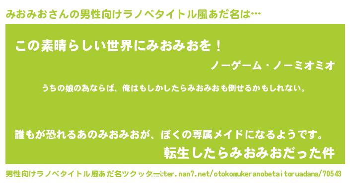 | 女子向けラノベタイトル風あだ名 | 『みおみお伯爵の花嫁』『みおみお恋絵巻』 |