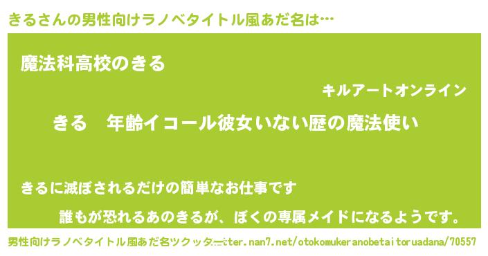 | 女子向けラノベタイトル風あだ名 | 『きるの玉の輿計画!』『きるの契約王妃』 |