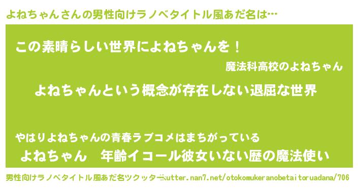 | 胡散臭い通販商品みたいなあだ名 | 『来世でも幸せになれる健康食品…その名も「よねちゃん」』 |