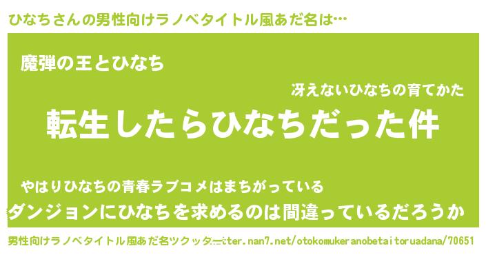 | 胡散臭い通販商品みたいなあだ名 | 『世界中を虜にした100年もののヴィンテージワイン…その名も「ひなち」』 |