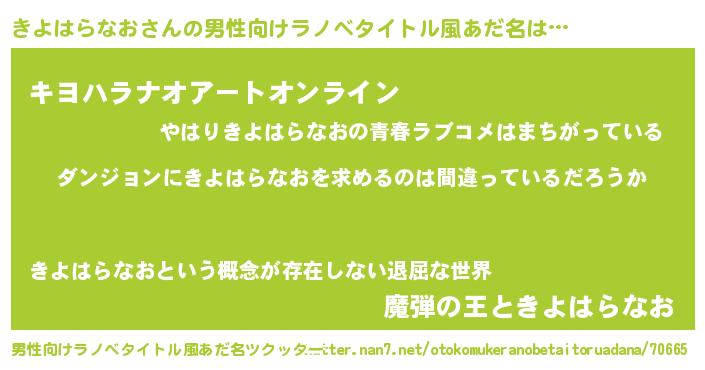 | 女子向けラノベタイトル風あだ名 | 『きよはらなおの卵を拾いまして』 |