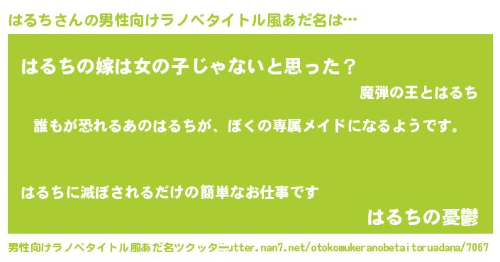 | 女子向けラノベタイトル風あだ名 | 『はるちの契約王妃』『はるち様がみてる』 |