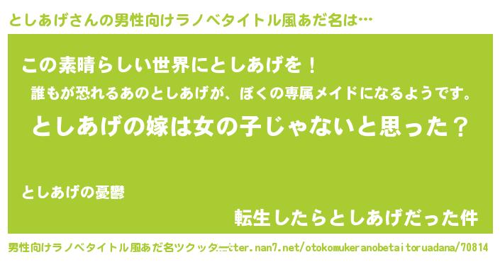 | 女子向けラノベタイトル風あだ名 | 『としあげ様がみてる』 |
