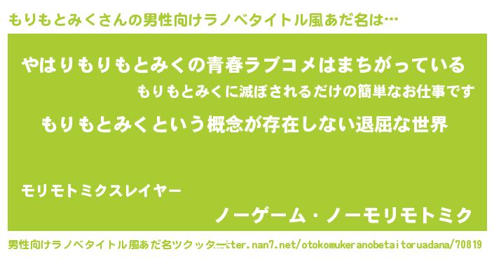 | 女子向けラノベタイトル風あだ名 | 『異世界で失敗しない100のもりもとみく』 |