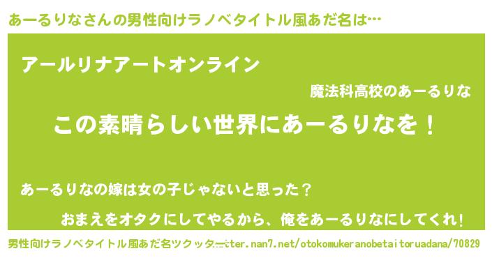 | 女子向けラノベタイトル風あだ名 | 『乙女ゲームの破滅フラグしかない悪役あーるりなに転生してしまった…』 |