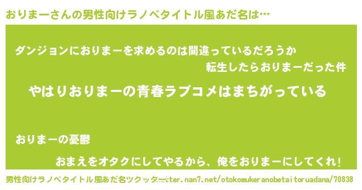 | 女子向けラノベタイトル風あだ名 | 『おりまー伯爵の花嫁』『おりまー恋絵巻』 |