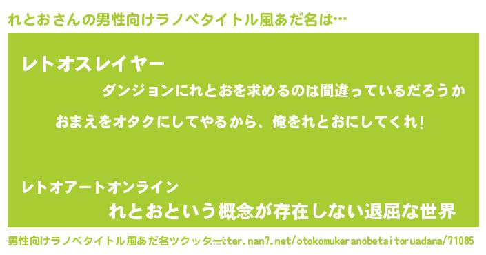 | 女子向けラノベタイトル風あだ名 | 『れとお恋絵巻』『れとおは平凡を望む』 |