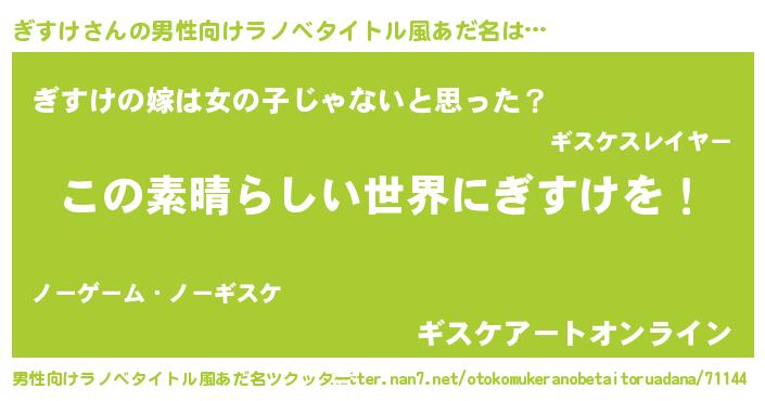 | 女子向けラノベタイトル風あだ名 | 『乙女ゲームの破滅フラグしかない悪役ぎすけに転生してしまった…』 |