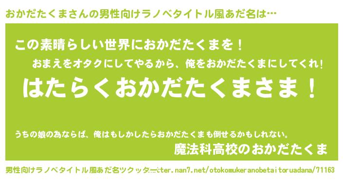 | 意味不明あだ名 | 『住所不定無職おかだたくま(71歳)』 |