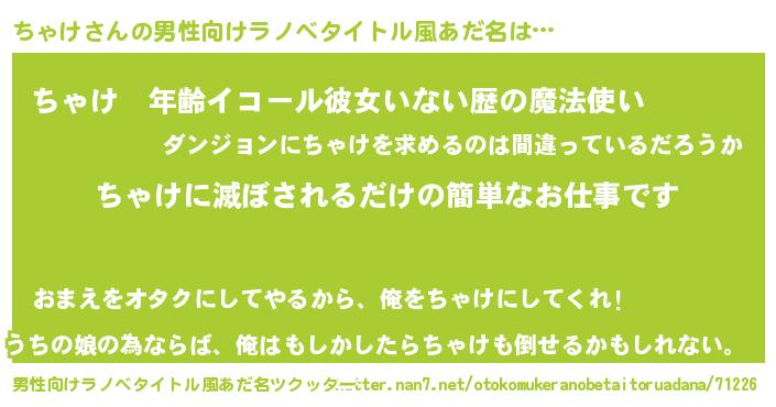 | 意味不明あだ名 | 『ヨモギ科ちゃけ属』『自称ちゃけ』 |