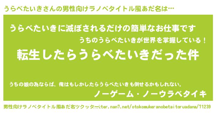 | 女子向けラノベタイトル風あだ名 | 『うらべたいきの玉の輿計画!』 |