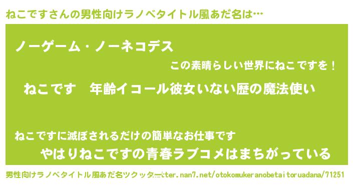 | 女子向けラノベタイトル風あだ名 | 『ねこですの玉の輿計画!』 |