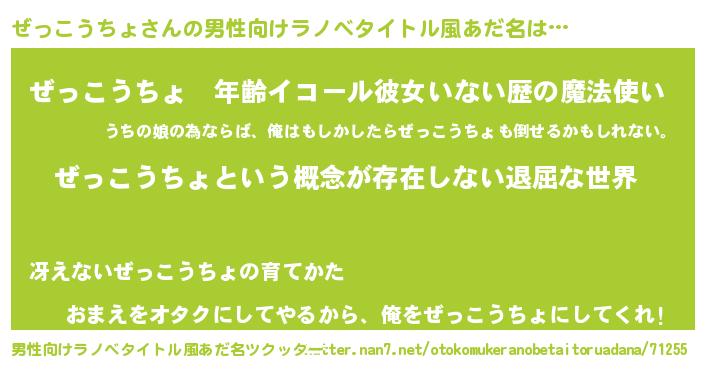 | 女子向けラノベタイトル風あだ名 | 『異世界で失敗しない100のぜっこうちょ』 |