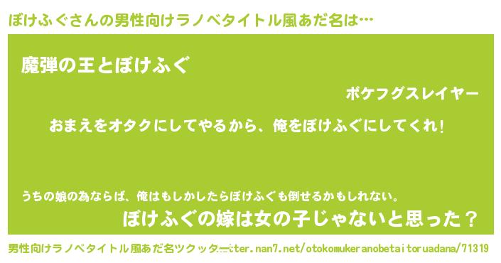 | 女子向けラノベタイトル風あだ名 | 『ぼけふぐ夫妻のなれそめ』 |