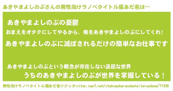 | 胡散臭い通販商品みたいなあだ名 | 『億万長者になれるブレスレット…その名も「あきやまよしのぶ」』 |