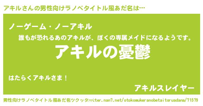 | 女子向けラノベタイトル風あだ名 | 『アキル姫と円卓の騎士』『アキル恋絵巻』 |