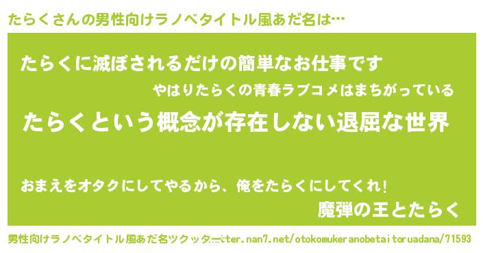 | 胡散臭い通販商品みたいなあだ名 | 『来世でも幸せになれる水素水…その名も「たらく」』 |