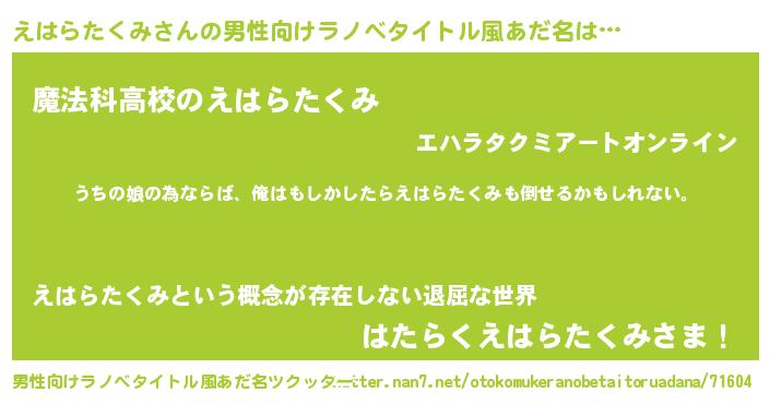 | 女子向けラノベタイトル風あだ名 | 『えはらたくみの婚約者』 |