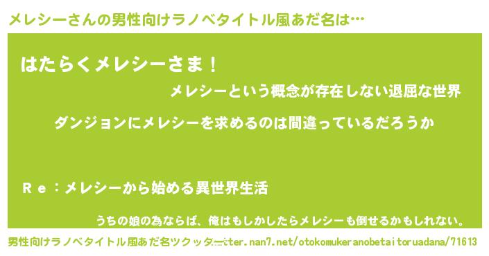 | 胡散臭い通販商品みたいなあだ名 | 『信頼と実績のサプリメント…その名も「メレシー」』 |