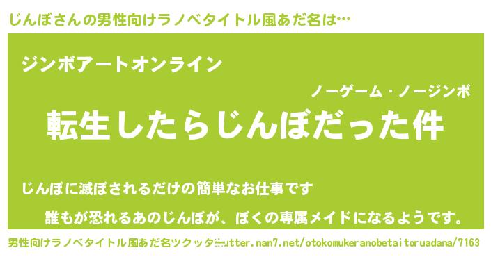 | 女子向けラノベタイトル風あだ名 | 『じんぼの玉の輿計画!』『じんぼ恋絵巻』 |