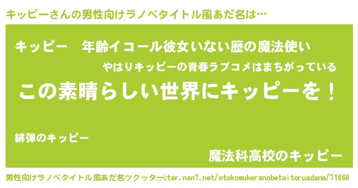 | 女子向けラノベタイトル風あだ名 | 『乙女ゲームの破滅フラグしかない悪役キッピーに転生してしまった…』 |
