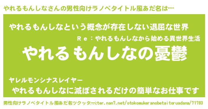 | 女子向けラノベタイトル風あだ名 | 『(仮)やれるもんしなのやんごとなき事情』 |