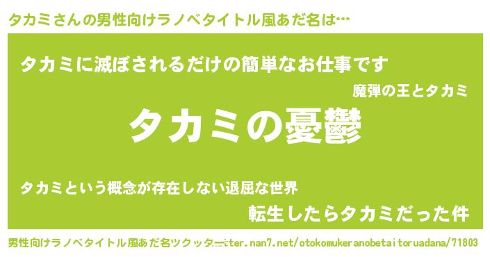 | 女子向けラノベタイトル風あだ名 | 『(仮)タカミのやんごとなき事情』 |