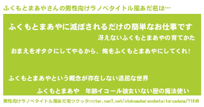 | 女子向けラノベタイトル風あだ名 | 『ふくもとまあや夫妻のなれそめ』 |