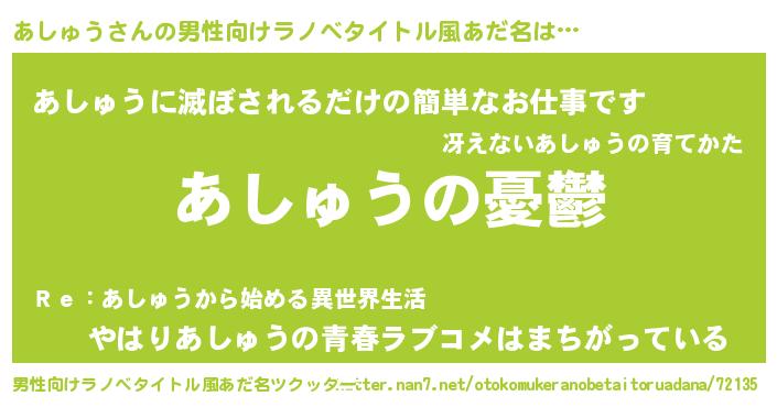 | 女子向けラノベタイトル風あだ名 | 『(仮)あしゅうのやんごとなき事情』 |