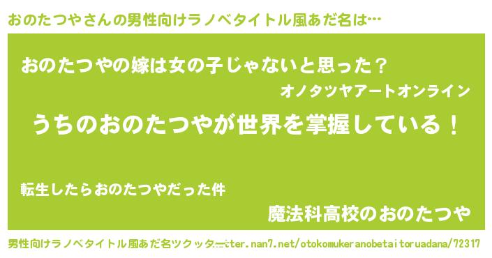 | 女子向けラノベタイトル風あだ名 | 『男装おのたつやの憂鬱な任務』 |